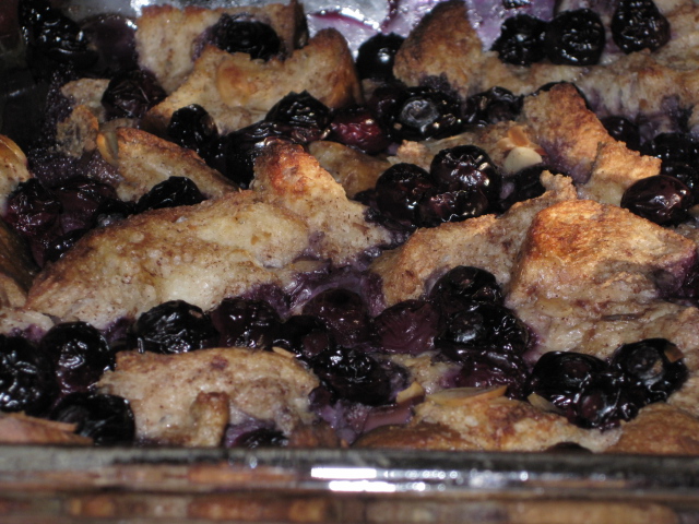 Pour the liquid mixture over the bread and allow it to sit for at least 30 minutes, mixing once or twice to be sure all parts of the bread are moistened. Mix in the blueberries and toasted almonds.